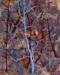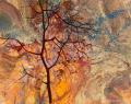 王朝刚与其作品在被阐释的过程中,逐渐形成若干组甚至带有矛盾张力的关键词辩证关系:第一,传统与当代的关系。“传统的当代转换”是中国当代艺术自上世纪八十年代以来的长期命题,却也因时代更迭而历久弥新。王朝刚绘画中所呈现的传统是叠合、生成、隐逸的混合体。例如《飞瀑》系列,既令人想起范宽《溪山行旅图》中的局部——水流奔袭、砸击地面,生猛有力;也具备石涛“山水清音”之悠然;更因层次交叠、反复覆盖的创作方式而带有些许黄宾虹“黑密厚重”之苍劲。另一方面,《飞瀑》多以瀑布为核心意象,亦容易引人联想至库尔贝那幅惊世骇俗的《世界的起源》。第二,宏观与微观的关系。《中国式风景》与《飞瀑》以山水为载体,抒发出艺术家的总体世界观与生命观;《知觉的森林》中既有宏大的自然景深,也藏匿细微的丛林叙事;至《盛景》,艺术家聚焦于生活周遭的花鸟虫鱼;而《秘境》则更进一步凝视枝叶微观,画面几近抽象。艺术家的视角犹如不断推进的镜头,实现了从全景到局部的多视野创作。第三,水与火的关系。若说水是王朝刚画作中的生命象征——他笔下的水流激昂澎湃,那么“火”则体现为艺术家在色彩选择上的倾向:红、黄、橙等暖色如火焰般燃烧于画布之上。这些闪烁生命欲望的焰光与水流交织,共同构筑出张扬、升腾、欢愉乃至狂欢的视觉景象。水体和红色皆为具有复杂文化意涵的象征物与象征色,它们的并置强化了画面中旺盛的生命动能。
