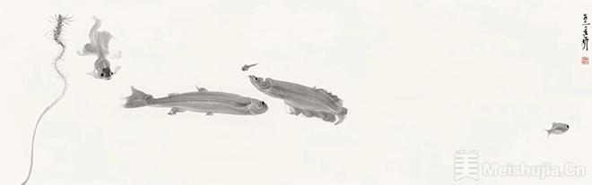 “有鱼”系列,正是这一理念的生动注脚。画面中品种各异的游鱼在淋漓的水墨氤氲中,化身为笔墨本身,其结构、姿态与动势,全然由高度概括而又力量内敛的笔墨构成。画家舍弃了繁复的细节雕琢,转而专注于笔墨语言的本体表现力,享受在单一主题与简约工具中不断生发、不断优化的艺术旅程,使观者直面其笔下所构建的一个纯粹而充满生命张力的水墨世界。这既是对中国画写意本质的当代诠释,也映射了画家返璞归真、直指本心的精神追求。