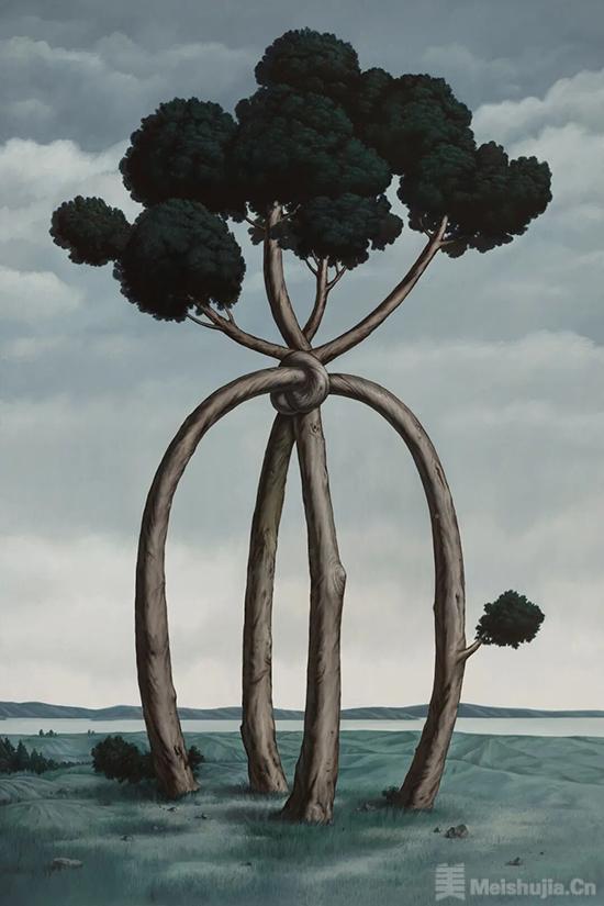 周松创作的另一核心在于“力量的可视化”,无论是《文明》中结构的弯折叠加,还是装置《暗能量》中以钢与铅笔构筑的垂直向上形态,皆在探索图像如何呈现“能量物质化”的过程。即便是《手相》《纽结》《枪》等尺幅较小的作品,也都体现了一种被解构的主体性,手、结、器物这些人经验中的可识别对象,在周松笔下转化为能量折叠、物态变形的容器。与此同时,周松进一步延伸了对“自然”概念的审视。在“超自然”系列中,他描绘的并非田园牧歌式的原初自然,而是经过技术彻底干预、改造甚至编撰后的合成景观。《奔月》不再讲述宏大历史叙事,《后自然》《新自然》中的自然亦不再是背景或客体,而是与科技、文化基因杂交共生的“后生命”形态。