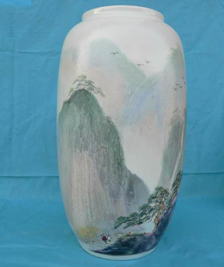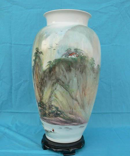 他所创作的陶瓷作品,无论是花卉,还是山水风景;不管是采用青花绘图,还是启用新彩表现技法,都善于把所绘情景,置于特定的陶瓷艺术氛围之中。同时又非常注意通过色调把整个画面有机地统一起来。这样就使他创作出来的陶瓷作品,不仅具有画中有诗,诗中有画的深沉的艺术内蕴,而且还呈现出一种深刻的世外桃源和现实感。