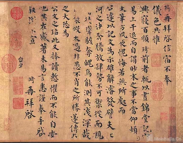 “琦再拜启,信宿不奉仪色,共惟兴寝百顺。琦前者辄以昼锦堂记□ (容)易上干,退而自谓眇末之事,不当仰烦大笔。方夙夜愧悔,若无所处。而公遽以记文为示,雄辞濬发,譬夫□ (江)河之决,奔腾放肆,势不可御。从而视□ 徒耸骇夺魄,乌能测其浅深哉。□ 褒假太过,非愚不肖之所胜,遂传□ 之大。恐为公文之玷,此又捧读慙惧,而不能自安也。其在感著,未易言悉。谨奉手启叙谢。不宣。 琦再拜启 □□□□台坐。”