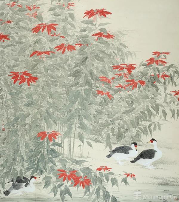 2.大画远看势,近看质。创作较大尺幅作品,需反复推敲构图,可先用木炭条轻轻勾画出点、线、面的位置,注意边梢变化及姿态,这些地方往往是次画眼,也是取势和情感表达的所在。尺幅较大的没骨画作品构图容易显弱,可以参考历代优秀山水画构图。将没骨画鸟画的点、线、面与其融合。大的关系确定后,开始由前至后起稿,深入刻画画稿,尽量做到精准,这样你在进行正稿创作时,就不会分神去考虑所要表达物像的位置和细节问题,可以全身心用画笔,表达自己的情感。大胆落笔,细心收拾,细节的刻画,也决定着作品的质量。高超的技法可以心手和一,充分表现自我情趣,良好的构图和用色可以提升作品格调与层次。
