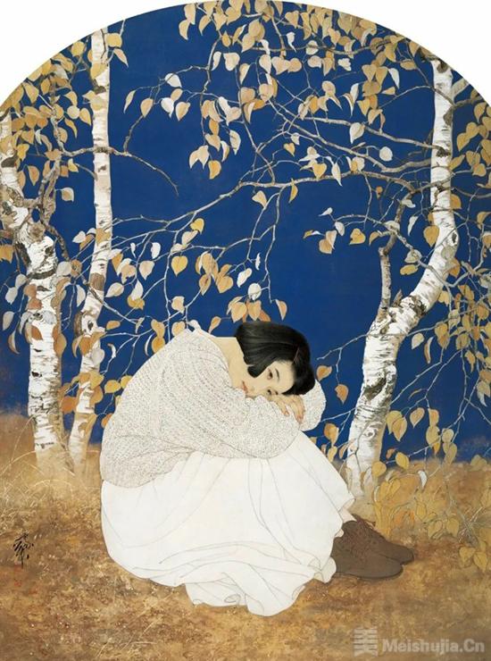 与《山地》同时酝酿创作的还有《十九秋》这件作品。甚至我在画《春城无处不飞花》的时候就一直在想如何去表现一个中国姑娘的形象。当我们看惯过去工笔画、仕女图中的人物都是大眼睛、双眼皮、小鼻子、小嘴、小下巴、一脸娃娃相的千篇一律、概念化形象,再与西方经典人物画比较就觉得不真实,这也给了我很深的印象,让我意识到:艺术的美不等于漂亮!