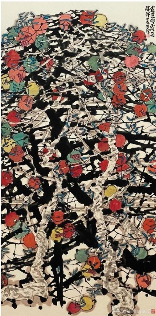 第三件作品《霜晨凝露蕊珠开》标志着其艺术语言的又一次蜕变:造型趋于抽象,色彩更加自由,空间更具现代感。但细细品味,那些看似随意地挥洒,实则延续着“三矾九染”的敷色传承;狂放的笔势中,依然可见徐渭大写意的精神血脉;而石榴爆裂的生命力,何尝不是对“气势”这一美学追求的终极诠释?