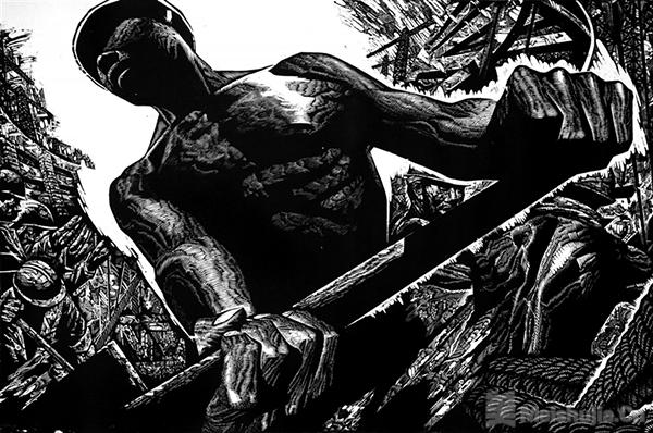 版画之线与国画之线的审美向度不同,这不仅是因为材质工具这类客观条件有所差异,还是因为创作者主观意识对艺术的判断有着各自的取向。从20世纪30年代的新兴木刻运动至今,许多版画大家都在揣摩版画的线,探究它既不同于国画,又能联通东方绘画意蕴的表现形式。版画用线构成的松紧张弛、长短错落的对比,形成了版画的表现意志。而这种表现的本质,即画家人性与材质物性相依互动,从而达到中国古代哲学所谓的“道器并置,天人合一”。