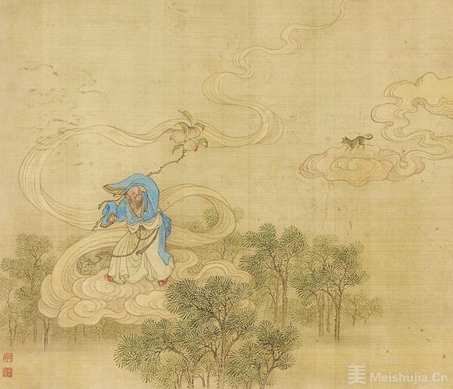 相较于其他画家所描绘的紧张氛围,清代冷枚笔下的东方朔则显得淡定许多。在其《神仙故事图册》之《东方朔偷桃图》中,东方朔脚踏缥缈祥云,自西天瑶池蟠桃园悠然遁往人间。他肩头稳稳扛着桃枝,枝上三颗仙桃饱满圆润、色泽诱人。回眸一瞥间,眸光流转似带狡黠笑意,与后方看守桃园、步履踉跄的神兽形成鲜明对照,将这充满奇幻色彩的瞬间定格得生动而富有戏剧性。画作以工笔重彩勾勒,笔触细密精巧,多样的曲线巧妙营造出强烈的视觉动感。