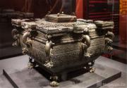 和曾侯乙铜鉴缶原理相同的,还有出土于湖北随州市文峰塔墓地的错金云纹铜鉴缶。该器物同样藏于湖北省博物馆,器身满饰错金三角勾连云纹并镶嵌绿松石,可谓颜值与实力兼具。