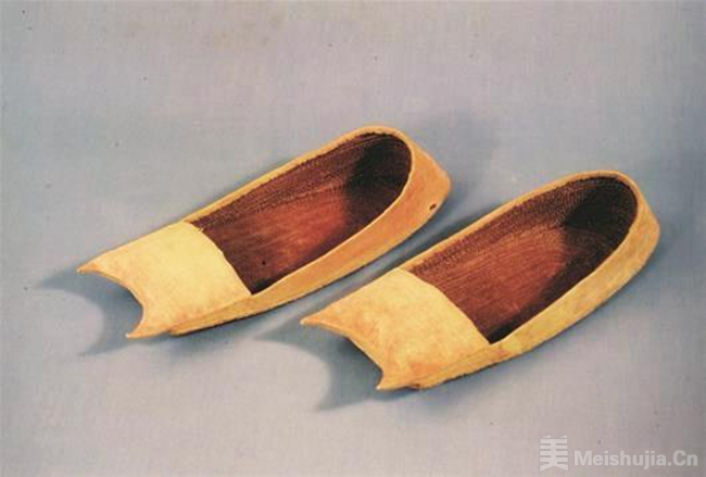 荆州博物馆还收藏了一双透气的汉代麻鞋。它于1975年在湖北江陵凤凰山168号汉墓出土,鞋面用白色平稳麻布制成,鞋里、垫、底均用麻线编织成人字纹,犹如现在人们夏日里常穿的“一脚蹬”。