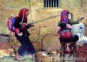 除了描绘自然景观,湿画法还被广泛应用于塑造拥有光滑质感的物象,如丝绸、金属、玻璃等。在应金飞的《逆光的肖像》中,女性人物的丝质衬衣呈现出柔和的光感,这样的光感一方面来自衣纹暗部与亮部的明度对比,另一方面则借助湿画法带来的柔和过渡,凸显了布料的柔软与光滑。而在陈坚的《收割》(图②)中,少数民族妇女的上衣同样以湿画法描绘,不同的是,画家采用了质地较粗的水彩纸,并巧妙借助纸面的肌理塑造出颗粒感,使衣服面料呈现出似绸又似纱的质感。可见,画家在创作中并非仅仅依赖技法本身,还需凭借经验与巧思,灵活调动各类材料的特性,最终实现质感的精准表现。