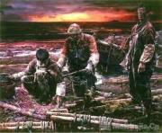 值得一提的是,在创作实践中,画家们也常常将湿画法与干画法进行有机结合,充分发挥二者优势,使画面刚柔相济,虚实相生。如刘永健的《尘土人生》聚焦了矿工作业的场景,画面前景人物的皮肤主要以湿画法塑造,衣饰主要以干画法刻画;背景下方布满锈迹的机械以干画法营造出硬朗、斑驳的质感,上方的天空则以湿画法绘就,通透润泽,仿佛刚下过一场解暑的大雨,为富有力量感的画面增添了一丝浪漫的气息,刚与柔的对比展现出强烈的艺术张力。