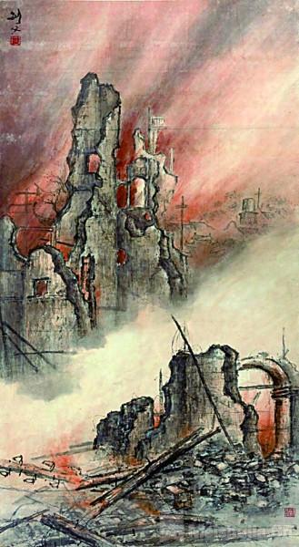1931年,九一八事变爆发。国难当头,激发了艺术家们奋发图强的决心。何香凝等国画家与中国画会等国画家组织,通过举办“救济国难书画展览会”“全国艺术家捐助东北义勇军作品展览会”等活动,发动国画家为前线募捐,凝聚后方力量,鼓舞抗战斗志。国画家王柱材在《改革国画的意见》中谈到彼时中国所需要的艺术时表示:“只有创造了,创造我们内心所受的创痕,创造我们看到杀人的悲惨,更要创造我们所不能受的帝国主义残杀我们的同胞们……这才是现在中国所需要的艺术。”呼吁国画家拿出反映现实的勇气。国难写照和抗战纪实,成为抗战时期国画引人瞩目的创作题材。沈逸千绘《有家归不得的关东人》,表现流离失所的东北同胞,高剑父绘《东战场的烈焰》(图②),描绘了被日军炸成废墟的上海闸北东方图书馆。