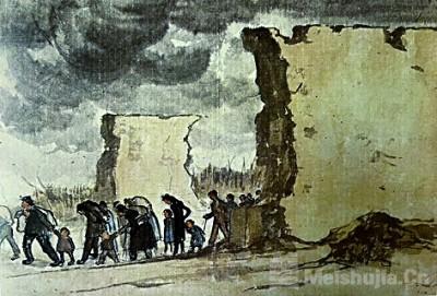 方人定绘《雪夜逃难》、关山月绘《寇机去后》、黄少强绘《失母儿哀啼饥》、张安治绘《劫后孤女》、李斛绘《战火中的难民》(图③)……一时间,画家们纷纷通过创作反映国难。赵望云的《三个游击战士》和沈逸千的《在山西敌后训练新兵实弹练习打靶》,皆以纪实笔调反映了敌后军民的抗敌斗争,蒋兆和表现国难的《流民图》等则成为现实主义绘画的经典作品,直抵人心,引发人们的深切共鸣。