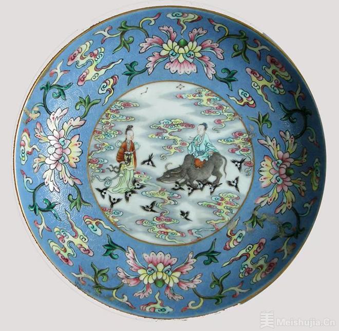北京艺术博物馆收藏的清代景德镇官窑粉彩人物图盘,就像一幅流动的七夕画卷。此盘工艺精湛,口沿涂金,熠熠生辉,尽显皇家气派。盘内外壁采用“粉彩轧道”工艺,天蓝釉地上浅浅的卷草纹似微风轻拂,粉彩花卉与朵云纹相互映衬,如梦如幻。盘内底描金圆形开光处,粉彩绘就的人物故事图案更为生动:牛郎坐于牛背,手握缰绳,深情凝望;织女身姿婀娜,娇羞回望,二人似在互诉衷肠。背景中祥云缭绕、星辰闪烁、鹊鸟纷飞,为这场相会营造了浪漫的氛围。外底“鹊桥仙渡”四字,点明主题。