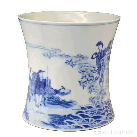 山东博物馆收藏的清光绪青花七夕卷筒,也描绘了牛郎织女在天河上即将相会的情景。卷筒图案中,祥云缭绕、喜鹊飞舞,鹊桥很快就会搭成。一年未见,牛郎拱手准备,对即将到来的见面迫不及待;织女衣袂飘飘,含情脉脉地望着日夜思念的牛郎。画中人物清丽洒脱、典雅高贵,器物主题鲜明、艺术性较高,真可谓秦观笔下“金风玉露一相逢,便胜却人间无数”的生动注解。
