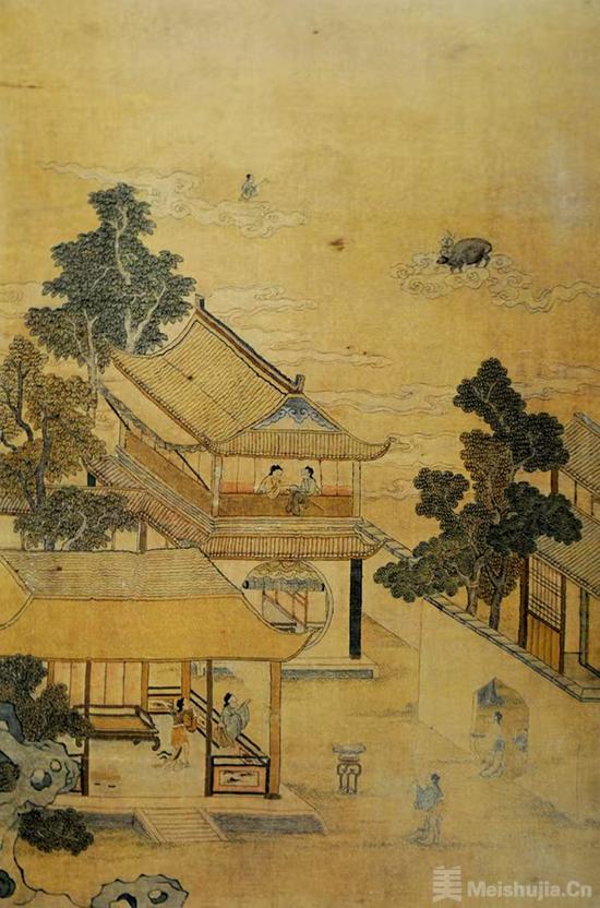 北京故宫博物院收藏的清代缂丝七夕乞巧图轴,将天上和人间完美融合:上半部分是天上,牛郎织女在祥云围绕下相会,眼神中充满了深情和眷恋;下半部分是人间,几位妇女或凭栏远眺,或对空乞巧,一派和谐景象。这幅图轴以缂丝工艺展现,色彩丰富、线条细腻,不仅展现了古人高超的技艺,也反映了当时社会对七夕节的重视和人民对美好生活的向往。