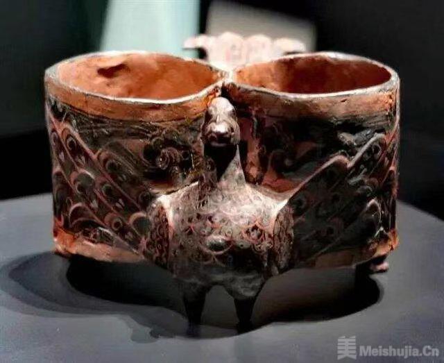 譬如现藏于湖北省博物馆的战国彩绘漆木凤鸟双联杯,1987年出土于湖北省荆门市包山2号墓,是古代合卺杯的代表。此杯整体为一鸟负双杯状,前端为头颈,后端出尾翼,中部并列两个桶形杯,杯之间有孔相通。杯子的凤鸟形状经雕刻而成,口中衔有一珠。为了使双联杯放置时更稳定,杯侧后部各有一凤开屏形状的杯足。凤鸟的头、颈、胸、尾遍刻象征羽毛的鳞状纹,全身除尾翼底面为红漆外,其他均髹黑漆,再用红、黄、金色绘勾连纹、圆圈纹、卷云纹等。此外,凤鸟首、腹和羽翅共嵌有银色宝石8颗,更显华贵俏美、身份不凡。凤鸟自古都是吉祥、富贵的象征,而合卺杯系新婚夫妇行合卺之礼所用的酒杯,也就是“交杯酒”的用具。战国彩绘漆木凤鸟双联杯造型奇特、雕刻细致,用漆工艺精湛,彩绘艺术高超,寓烂漫与写实于一体,属于先秦漆木工艺的杰作。