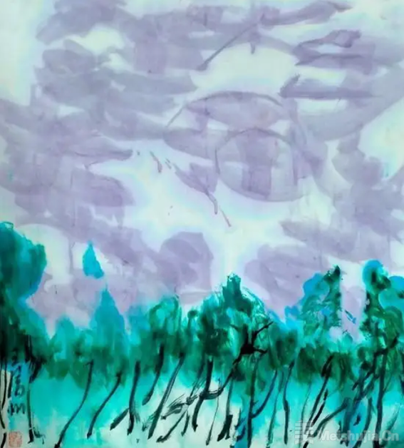 王清州参展的彩墨作品《紫云翠影》以其诗意的抽象语言和独特的色彩表达,受到组委会及观众的高度认可。作品以淡雅的紫色和翠绿色为主调,营造出静谧而神秘的意境——紫云轻盈流动,绿山沉稳生机,形成虚实相生、层次丰富的视觉结构。笔触流畅而富有力度,既传承东方水墨的传统精神,又融入当代审美与创新意识,体现出艺术家对自然与生命的深刻感悟。