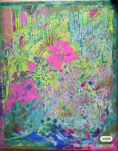 她的“新东方抽象”系列以破坏性笔法重构东方美学:色彩之间的碰撞,晕染的层次又暗合哲学的理念。“何君宏的抽象不是西方式的几何解构,而是东方哲学的视觉化——一种关于混沌、无常与和谐的当代诠释。”