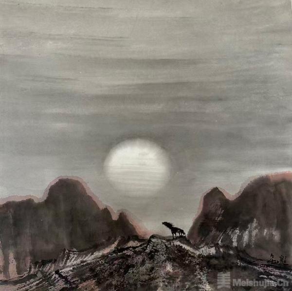 吴建军历来取百家之长,补一已之短,从其绘月作品中可以看出,他向古人学、向前辈学、向先进的绘画理论学,方有今日之成,在绘画艺术的探索之路上,悟师之学,研师之求,懂师之道,充分体现中国文化的包容、发扬、光大的博大情怀,向着艺术的高峰不断攀登。吴建军结合自己的悟解和绘画技艺的提高,向着李可染大师的绘画技法不断靠近,李可染先生的启蒙老师为钱食芝先生,他跟钱先生系统学习中国传统山水画的画法,继承了清初“四王”风格,奠定了笔墨与意境基础;在杭州国立艺专,接受林风眠和安德烈·克罗多先生的指导,中西融合,探索艺术创新;1947年,李可染先生拜齐白石先生为师,深刻领悟中国画的要诣;后来师从黄宾虹先生,探讨运用积墨法和破墨法来表现山水画的层次与质感,使他的作品具有了独特的个性和风格;1967年,李可染先生防德期间,结合自己早年受伦勃朗油画中“明暗对比”和“布光法”的启发,通过黑山黑水中留白的方式,借鉴了伦勃朗在昏暗背景下突出局部光亮的技法,尝试将这些绘画技法融汇到自己的水墨画创作中。安德烈·克罗多是法国印象派画家,伦勃朗则被誉为西方古典油画巅峰,李可染先生在晚年结合中西多位大师的艺术探索成就,并将“逆光法”通过主观用光强化画面效果,使作品带上了东方美学特有的含蓄与诗意,形成了独特的视觉层次感,成为他后期艺术成就的重要标志。吴建军在创作过程中受西方印象派莫奈、塞尚等大师的影响,结合学习李可染先生的绘画艺术成就,不断改革和完善自己的绘画技法,在《大月无声》里,充分体现了这一艺术探索,天月地貌融为一体,积破相宜,明暗对比,层次分明,动静结合,月光下,旷野里的野马狂放着表现自我,如虎啸,像狮吼,似龙吟,天地之间的万物生灵都在享受着月夜的静与动所带来的美伦美奂,等待着黎明的曙光!