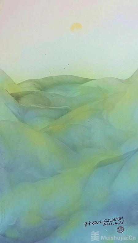 2.传统符号的当代表达:月亮承载着丰富的传统文化内涵,如相思、团圆、超逸等。赵先闻通过拓彩技法对其进行的非具象化呈现,是对传统文人画精神的一种现代性转译。