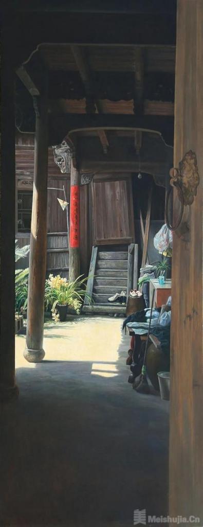 古人对太阳的雅称叫扶光,太美了,扶着光,就是要抓住这光。老单早些时候画了一批老家农村里的房子,画室内场景,总有一束光照在灶台上、桌子上,一些毫不起眼的物件上。这种处理方式具有维米尔式的古典油画精神,光线的聚焦点是一幅作品的画眼,传达出作者的用意,为什么要照向平凡的物象,为什么暗暗的房间里要有光,我想是这样的,背阴向阳,追求光明,这束光在他的眼里是来自圣域的光,在它的照耀下,一切平凡的事物仿佛都有了神性。