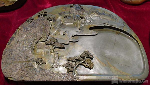 贺兰石独具地域特色,以其雕刻而成的工艺品,既显塞北粗犷豪放的风格,又具江南细腻灵巧的神韵,集使用、观赏、收藏于一身,是宁夏独有的文化符号与艺术珍品。用贺兰石制成的砚台,温润如玉,绀绿无瑕,质坚而细,色嫩而纯,滑不拒墨,涩不滞笔,能使松烟浮艳、毫颖增辉,加盖后余墨数日不干不臭,兼之砚台雕刻样式千姿百态、美不胜收,更使之名声大噪——曾与端砚、歙砚齐名,有“一端二歙三贺兰”之说,深受历代文人、书画家的喜爱。清光绪年间,宁夏知府赵惟熙曾赋诗赞美它:“贺兰富砚材,堆砌成小山。夙有临池兴,薄书傥余间。”