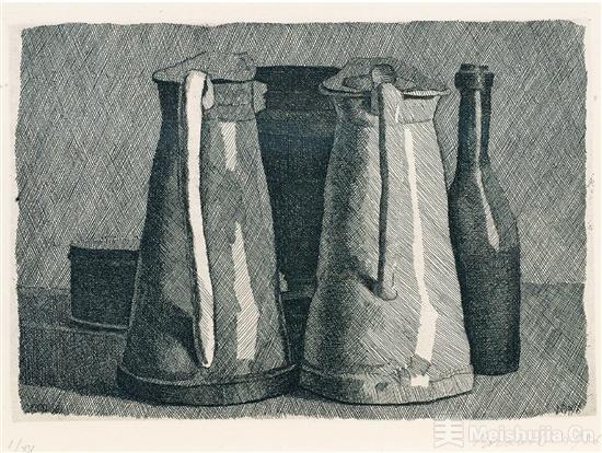 1920年,莫兰迪约30岁,他到威尼斯双年展的法国馆看塞尚展览。细看塞尚作品之后,经历了一小段塞尚式的静物写绘,随即朝向一生发展的个人风貌走去。1921至1922年的静物画,器物沉浸在似幽似明的光中,画面呈现了新的物理性与新的内涵:在油画方面他专注于静物表现,暗示出物体的三维空间与背景两到三个平面相互的关系。20年代后半期,他的铜版、锌版上的蚀刻版画,陆续参加了1927年佛罗伦萨第一届版画展,1928年及1930年的威尼斯双年展,以及1930年巴黎国家图书馆版画展。