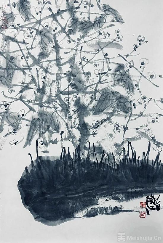 写意,就是要在“写”上下功夫。我总觉得,一位画画的人,他有“写”的精微的功夫,他的“意”自然景象阔大。所以,每当我提起毛笔,整个精神贯注于此,心无旁骛。在一平尺以内造象立境,是考验人的素养的,有的时候,缺少一点点,事情就不能成立,可是我愿意试一试。在一两尺的空间中,如何施展中国画的透视法呢?或者说它存在多少可能的透视关系呢?我们正好借此思考一下中国艺术观照世界的办法。中国艺术是一种主观的观察法,一种主观的感受,而且往往是某种诗意的流露。在中国写意画中,不是客观决定主观,而是主观决定客观,也就是说,中国写意的对象不是实象而是心象、情中之象、意中之象。古人云:“山川草木,造化自然,此实境也。因心造境,以手运心,此虚境也。虚而为实,是在笔墨有无间,故古人笔墨具此山苍树秀,水活石润,于天地之外,别构一种灵奇。或率意挥洒,亦皆炼金成液,弃滓存精,曲尽蹈虚揖影之妙”(方士庶《天慵庵随笔》)。我想,事情就在这“弃滓存精”“蹈虚揖影”八字之中了。中国笔墨的提炼之功,某种程度上是不必看尺幅与空间的,只要有足够的精神在,小尺幅即大文章,所以我愿意试一试惜墨如金,愿意继续学习与体验中国艺术的本质精神。