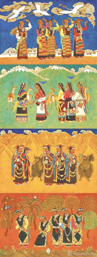 在他的布画、水墨里,以“仪式”冠名的系列作品,一画十数年,如其中的《牧歌》《舞蹈》《日蚀》《风》和《雨》等,人物的面貌、姿态或庄重或日常,用笔工细而不腻,设色彩艳而不厚重,赋予这个古老的命题以当代性,让观众油然产生从容的美感。作画材质也很讲究,选用西藏矿物、植物颜料,艳丽地装饰出西藏各地的妇女和山水风貌的美好。