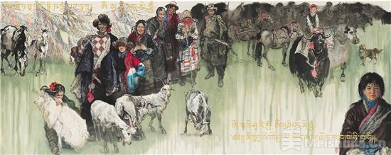 他热爱西藏,西藏是他创作的灵感源泉。他曾两次深入西藏,被高原的雪域风貌和藏民坚韧淳朴的民风所打动,创作出一大批反映西藏人民美好生活的作品。2021年12月,梁平波将他呕心沥血创作的最具代表性和最具震撼力的36件精品,无偿捐赠给了浙江美术馆,其中大部分为西藏题材作品。这批作品或为大型组画,或为主题性创作巨制,格局宽广,气象宏大。其中,巨幅长卷《走进西藏》由9幅画面组成,高1.4米、总长32.4米,展现了187个栩栩如生的藏族人物形象和雪域高原的壮丽景色。如此气势磅礴,情动于衷的画卷最能反映他所追求的史诗气质和人性礼赞。正如他为笔下人物整体性地赋予了生活强者的底蕴一般,激情与挑战也是梁平波作为画者的性格底色。