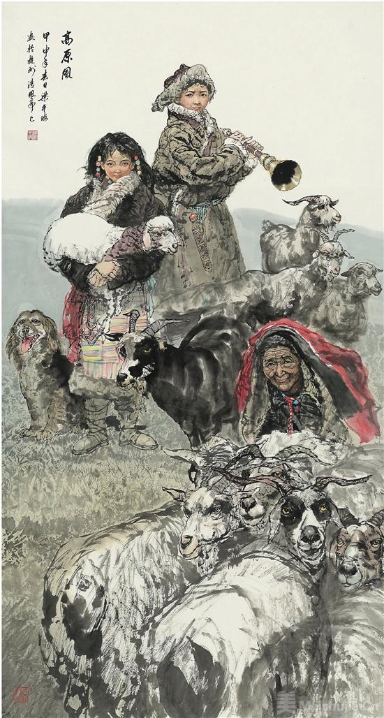 梁平波南北两地的求学经历在夯实其写实功底的同时,也开拓了他的艺术视野,作品既含有中央美术学院“徐悲鸿-蒋兆和体系”的严谨,又透出“浙派人物画”灵动、洒脱的意蕴。梁平波的作品传承了“浙派人物画”精髓,注重中国传统笔墨品格的同时有机融合了西方绘画的透视、空间、光影等造型法则;以现实生活为创作源头,既侧重通过真实刻画人物形象传达丰富而精微的内心世界,又充分开掘了笔墨审美的潜力与可能。厚重明快、线条老辣、墨色华滋、意境开阔的画风,予人以蓬勃向上的精神力量和感召意味。写实与笔墨兼备的修养,使他成为“浙派人物画”第二代画家的重要代表之一。