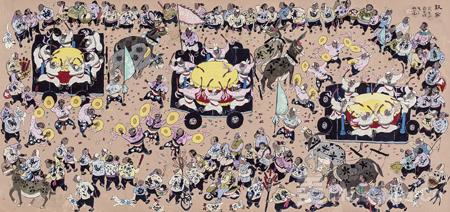 耿占雄不仅用画笔守住乡土记忆,还从过去的民风民俗画到了当今新时代、新“三农”。他说,“民间艺术在于不断地创新,不能吃老本,要不断接受新事物,让新事物与传承技艺紧密连接”。他的作品《冀中的婚礼》再现了上世纪90年代辛集当地热闹的婚嫁习俗;《直播今天的好日子》反映的是当下农民与时俱进,直播卖货;《鼓赛》则展现了民俗表演“束鹿战鼓”。